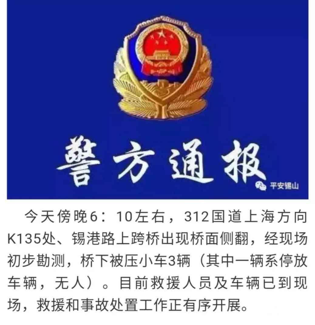 記者從無錫市錫山區警方獲悉,10月10日下午6:10左右,312國道上海方向K135處、錫港路上跨橋出現橋面側翻事故,經現場初步勘察,橋下被壓小車3輛(其中一輛系停放車輛,無人)。目前救援人員及車輛已到現場,救援和事故處置工作正有序開展。