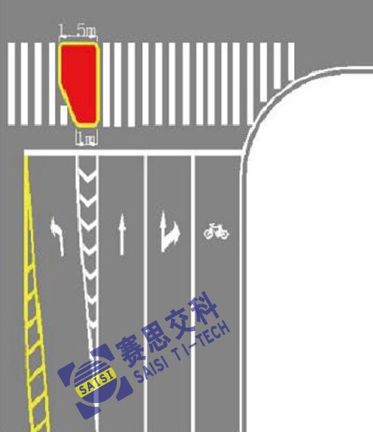 為提高人行橫道的通行秩序與效率,在具備可施劃6m寬度人行橫道線的條件下,可采用導向式人行橫道線施劃方式,線寬為45cm,兩段線長都為3m,兩段線間隔30cm,實空對稱交錯施劃,在人行橫道線的兩端按照靠右通行的習慣添加導向箭頭,具體尺寸如下圖所示。