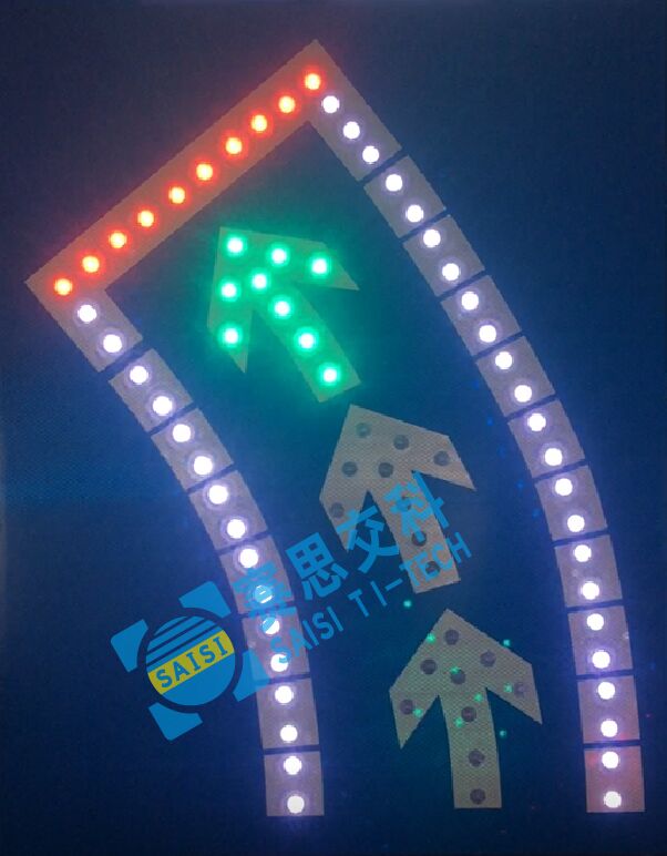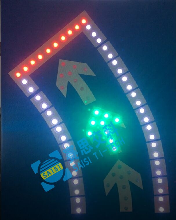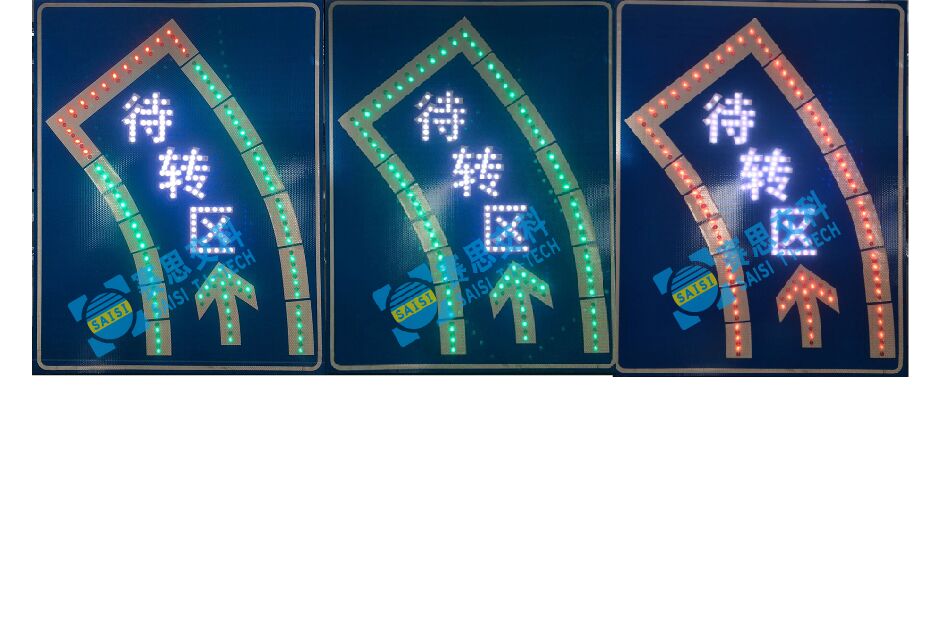 2、工藝說明:標(biāo)志版面由LED發(fā)光管組成停車線、邊緣線、箭頭圖形,通過控制模塊調(diào)取信號(hào)燈燈色狀態(tài),在標(biāo)志版面形成動(dòng)態(tài)三種狀態(tài),動(dòng)態(tài)引導(dǎo)待轉(zhuǎn)車流通行權(quán)限。