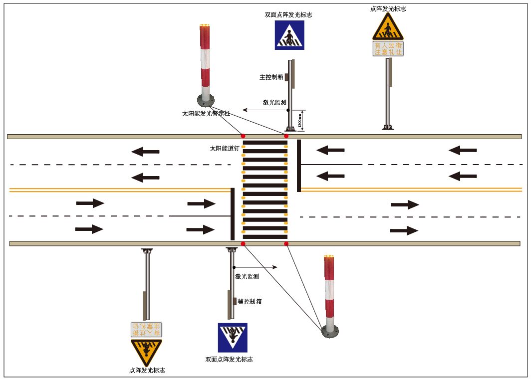 本智能行人過街預(yù)警系統(tǒng),主要包括:激光雷達(dá)監(jiān)測設(shè)備、人行橫道發(fā)光指示標(biāo)志(雙面)、注意行人發(fā)光警告標(biāo)志(輔標(biāo)"有人過街、注意禮讓")、語音播報器、太陽能發(fā)光警示柱、太陽能發(fā)光道釘、無線數(shù)據(jù)傳輸模塊、總控制系統(tǒng)(含軟件)等。