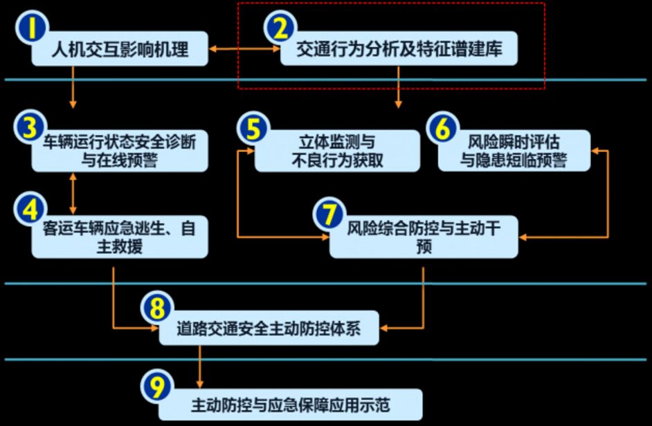 “道路交通安全主動防控技術與系統集成”為國家重點研發計劃項目,整個項目共包括九個課題:(1)不同道路類型與交通環境條件下人-車交互影響機理;(2)道路交通行為分析及特征譜建庫技術;(3)車輛級和網絡級在途車輛運行狀態安全診斷與在線預警平臺(4)重大事故下客運車輛應急逃生、自主救援關鍵技術及裝備;(5)道路交通行為立體監測與不良行為高準確獲取技術及裝備;(6)特殊條件下道路交通安全風險瞬時評估與隱患短臨預警平臺;(7)道路安全(行駛車輛)風險綜合防控與主動干預技術及裝備;(8)基于聯網聯控監測信息的道路交通安全主動防控體系與系統集成;(9)道路網交通安全主動防控與應急保障技術示范及應用。該項目通過在云南、北京、上海、重慶、河北、陜西、廣東開展示范應用,形成了覆蓋多種道路類型、不良駕駛行為的工程實施效果評價方法。