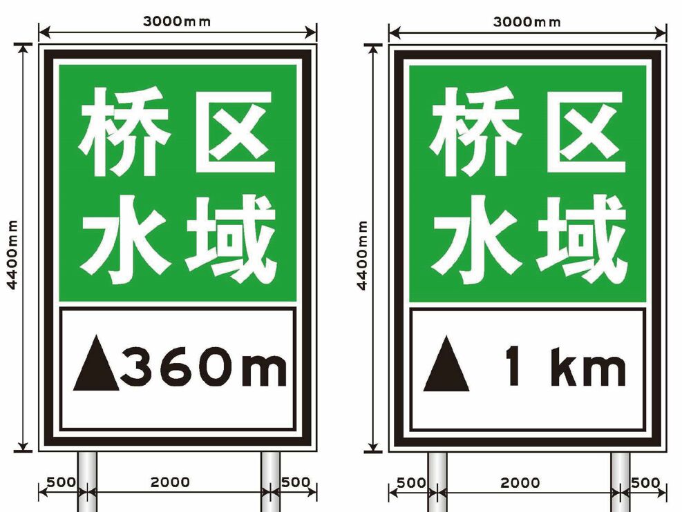 “橋區水域”航道指示標志,設置于河道兩岸合適位置,主要用于告知通行船舶注意前方橋區水域的劃定范圍,方便船舶駕駛員能準確、及時獲取航道水域相關信息。其版面分上下兩部分:上部,藍底白字(橋區水域);下部,白底黑字(三角+距離數字);整體黑色邊框。版面尺寸通常為:3000mm *4400mm。通常采用雙立柱安裝方式。如下圖所示: