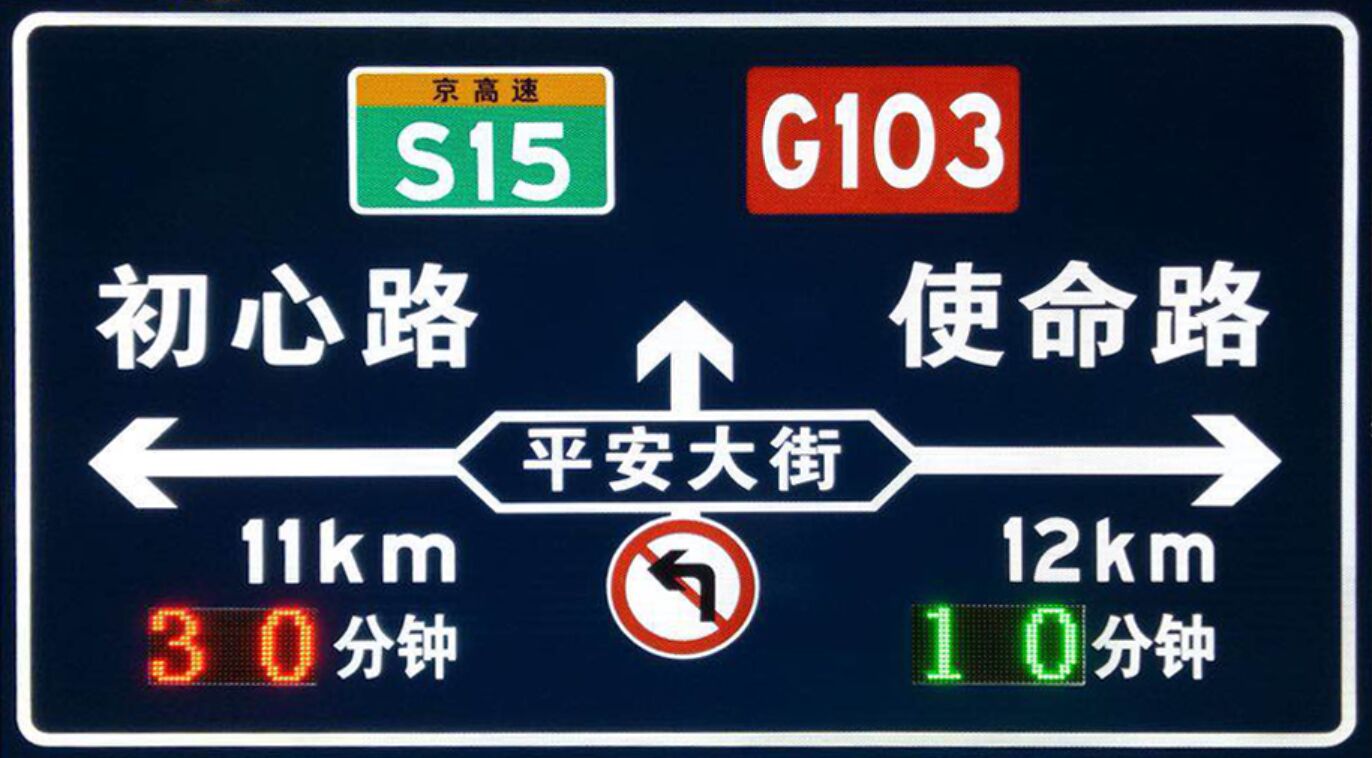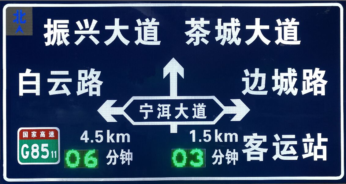 將標(biāo)志安裝點(diǎn)位與重要節(jié)點(diǎn)的距離長度、到達(dá)預(yù)估時間有效統(tǒng)一在標(biāo)志版面中,給機(jī)動交通參與者提供時間、空間的實(shí)時數(shù)據(jù)參考,及時改善行車預(yù)期軌跡,為交通管理部門緩解交通擁堵,合理分配區(qū)域交通流,提供有效的宏觀規(guī)劃。