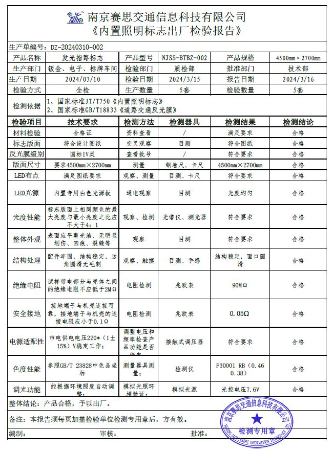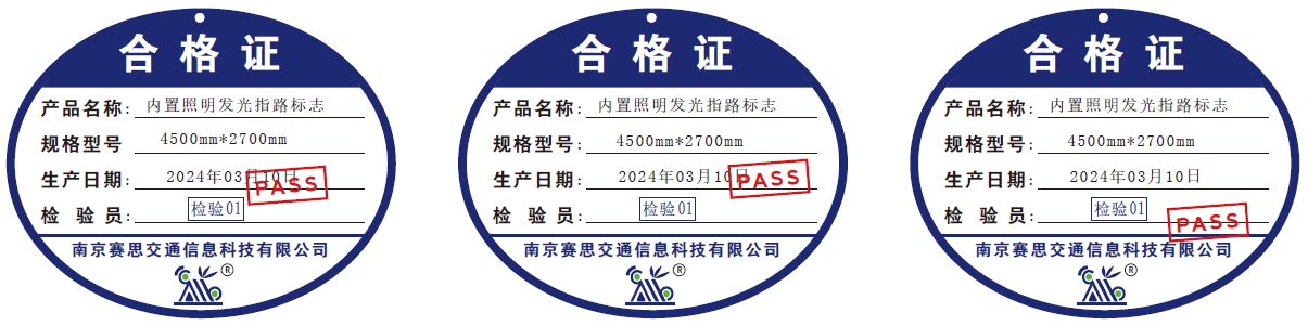 (10)文件材料檢查。最后,我們在發(fā)光標志產品批量打包,準備發(fā)貨前,還需檢查所供貨品的文件資料是否齊備,主要包括:《出廠檢測報告》、《合格證書》、《安裝說明書》、《交貨清單表》、《公安部檢測報告》等,為方便客戶向業(yè)主交貨,提供必要的交貨資料。